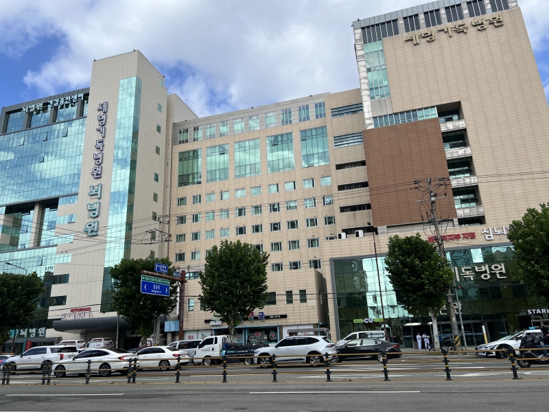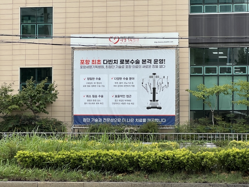 10월 15일 오전 10시, 포항세명기독병원은 평일 오전임에도 1층 로비가 진료 대기 환자들로 붐비고 있다. 병원 내부 곳곳에는 ‘로봇수술 100례 달성’과 ‘포항 최초 다빈치 로봇수술 본격 운영’이라는 현수막이 걸려 있으며, 대형 전광판에서는 암 진단부터 수술·항암·방사선·면역치료까지 원내에서 통합적으로 제공한다는 세명암병원의 홍보 영상이 연속 재생되고 있다. 특히 2023년 미국수부외과학회(ASSH)에서 Clinical Pearl Award를 수상한 연구 성과를 전시하며 학문적 위상과 연구 역량을 함께 드러내고 있다.