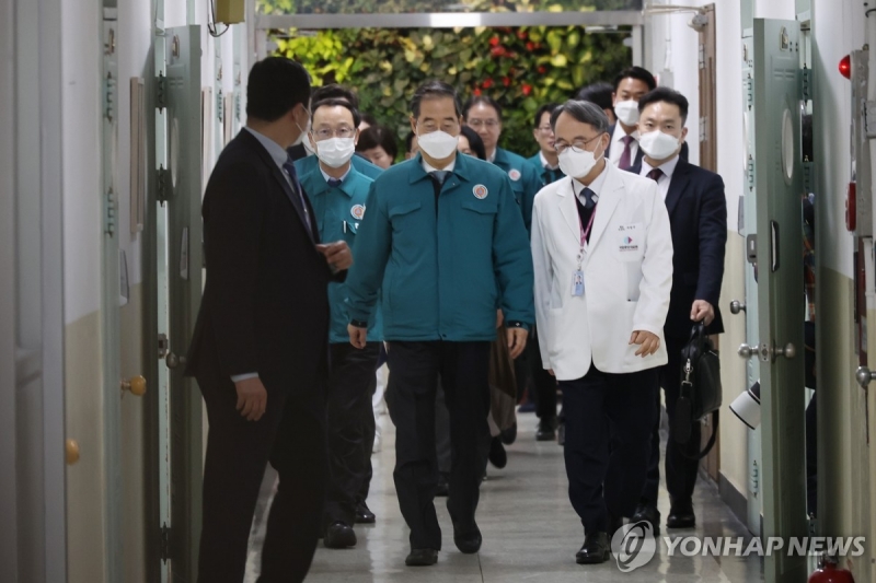 정부의 의과대학 입학정원 확대 방침에 반발해 전국 상급종합병원 수련의들이 연이어 사직서를 제출하는 가운데 2월 19일 오후, 한덕수 국무총리가 의료 현장 대응을 점검하기 위해 서울 중구 국립중앙의료원을 방문하고 있다