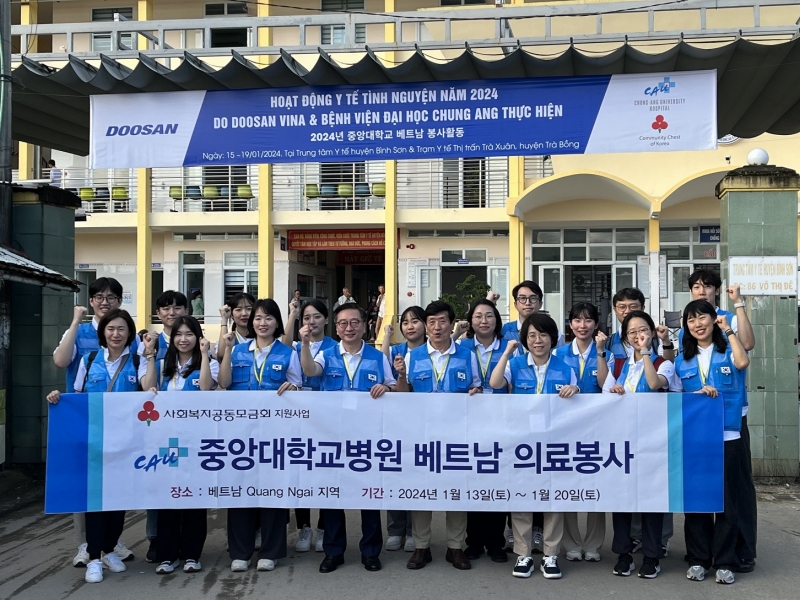 중앙대병원은 사회복지공동모금회 지원사업(두산 지정기탁사업)으로 최근 7박 8일간 베트남 현지에서 의료봉사 활동을 펼쳤다. 의료봉사단은 중앙대병원 김선미 교수(정신건강의학과)를 단장으로 의사, 간호사, 약사, 사회복지사 및 중앙대 의과대 및 간호대, 약대 학생 등 18명으로 구성됐다. 봉사단은 베트남 빈 슨(Binh son) 지역과 짜 봉(Tra Bong) 지역 보건소에서 현지 주민 1500여 명을 대상으로 내과, 소아청소년과, 정형외과, 산부인과 진료를 하며 의약품을 전달했다.