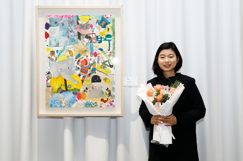 JW그룹 공익재단인 중외학술복지재단은 11월 22일 경기도 과천시 소재 JW과천사옥에서 ‘2023 JW 아트 어워즈’ 시상식을 개최했다. 대상 수상자인 정영은(29세, 발달장애) 작가가 수상작 ‘인생은 아름다워2’ 앞에서 기념촬영을 하고 있다. ‘JW 아트 어워즈’는 중외학술복지재단이 주최하고 JW그룹이 후원하는 행사로, 장애인 예술가들에게 창작활동의 기회를 제공하기 위해 마련됐다.