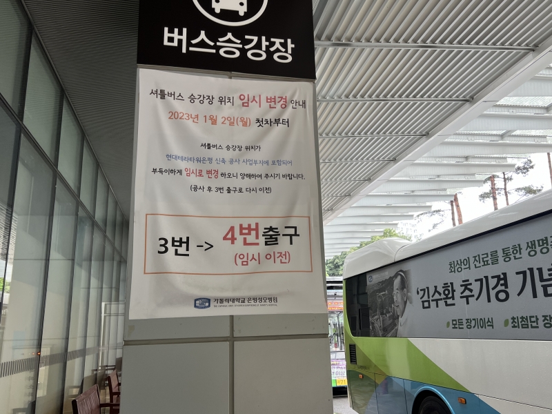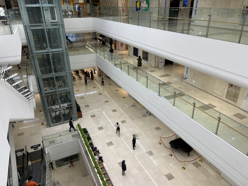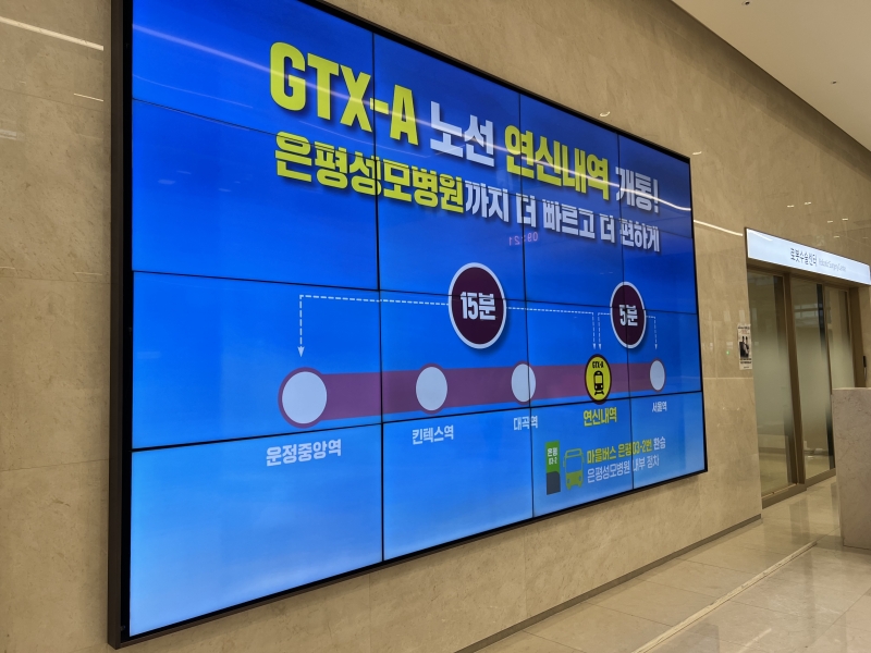 입구 쪽에서는 자동 회전문 유지보수 작업이 한창이다. 안전모를 착용한 외부 기술진과 병원 관계자들이 함께 회전문 작동 상태를 점검하고 있으며 출입 통제가 부분적으로 이뤄지고 있다. 원내 곳곳에는 모바일 앱 리뉴얼 안내와 기부 참여 홍보존, GTX-A 연신내역 개통 홍보 패널 등 다양한 병원 정보가 걸려있다.