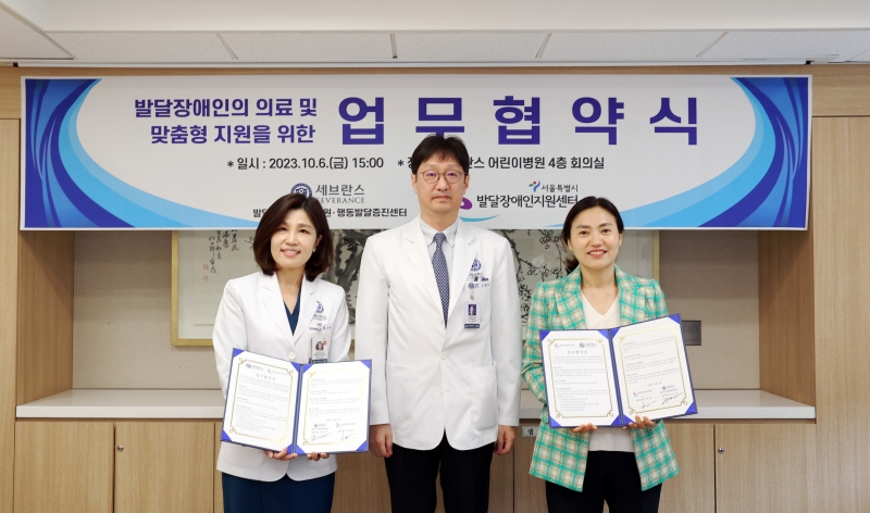 세브란스병원 발달장애인 거점병원·행동발달증진센터(센터장 천근아)가 최근 서울특별시발달장애인지원센터와 발달장애인 건강권 보장 및 의료접근성 강화를 위한 업무협약을 체결했다. 센터는 이번 협약을 통해 의료서비스 사각지대에 놓인 발달장애인에 대한 의료지원을 강화하고 치료적 개입이 필요한 발달장애인 도전적 행동 치료도 확대해 나갈 예정이다.