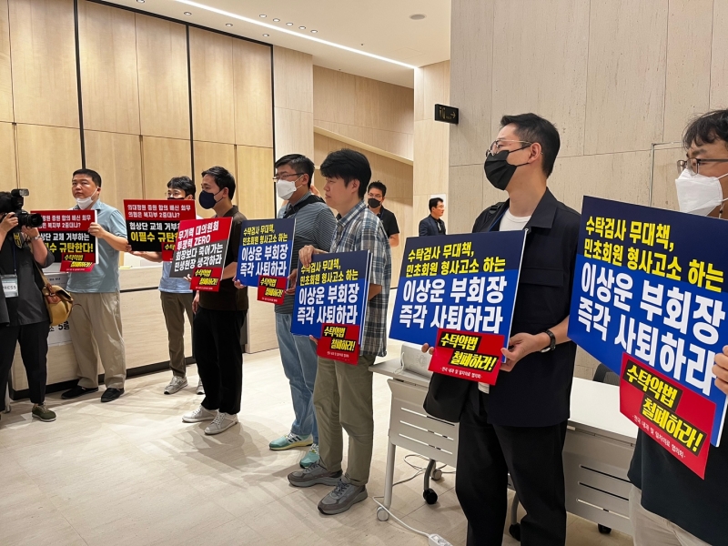 대한의사협회가 7월 23일 서울 용산 의협회관에서 임시대의원총회를 열었다. 이날 수탐검사 관련 대책에 항의하는 젊은 의사들이 임총 회의장 앞에서 '수탁악법 철폐, 이필수 회장 규탄한다'는 피켓 시위를 벌이고 있다.