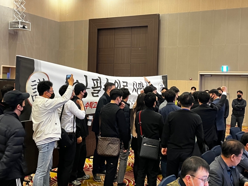 박민수 보건복지부 제2차관이 4월 23일 열린 대한의사협회 제75차 정기대의원총회에 참석해 축사를 하고 있는 가운데 일부 의사회 회원들이 "수탁고시 제정안을 철회하라"고 항의하며 실랑이가 벌어졌다.