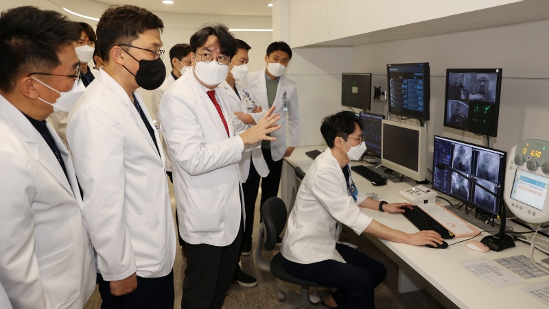 연세의료원이 4월 28일 중입자치료를 시작했다. 첫 치료 환자는 60대 전립선암 2기 환자다. 환자는 전립선 피막 안에만 1.2cm 크기 종양이 존재했고 림프절과 주변 장기로 전이는 없는 상태였다. 의료진이 해당 환자에 대해 포지셔닝룸에서 엑스레이 검사 결과를 확인하고 있다.