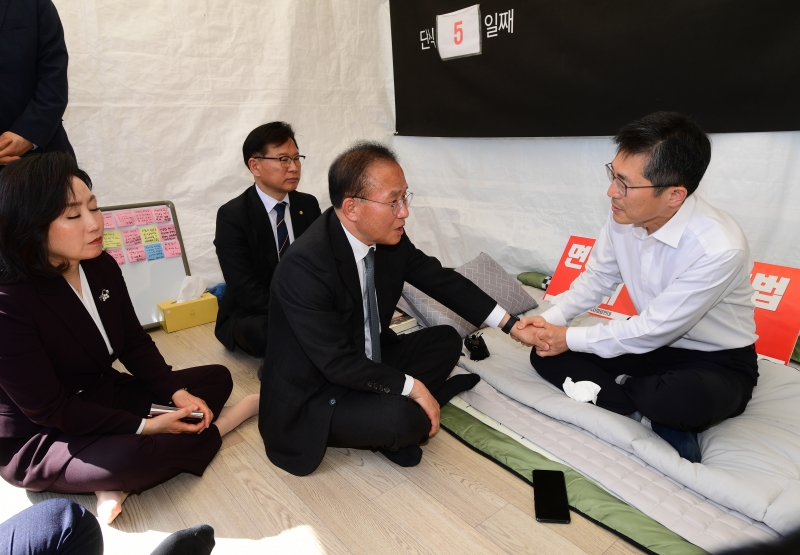 국민의힘 윤재옥 원내대표와 이양수 수석 부대표 등 여당 주요 인사들이 이필수 대한의사협회 회장이 단식 5일차를 맞은 지난 5월 1일, 현장을 방문했다. 윤재옥 원내대표는 이필수 회장에게 "단식을 중단하고 문제 해결을 위해 함께 하자"며 "국민의힘에서도 노력할 것이다. 건강을 챙겨야 싸울 수 있다"고 설득했다. 이필수 회장은 "보건복지의료단체가 간호법과 의료인면허박탈법에 대한 문제점을 지적하는 등 법안이 가진 위험성을 경고했지만 의견은 철저하게 무시됐다"고 말하며 눈물을 참지 못했다.