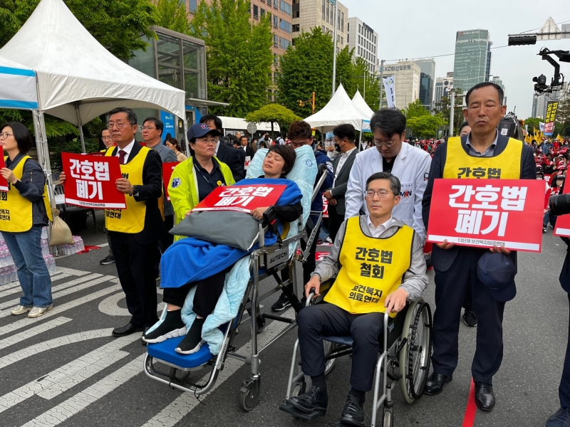 단식 투쟁 중인 대한의사협회 이필수 회장과 대한간호조무사협회 곽지연 회장이 3일 국회의사당 앞에서 열린 간호법 및 의료인면허박탈법 강행처리 400만 보건복지의료연대 규탄대회에 나란히 휠체어를 타고 참석했다.