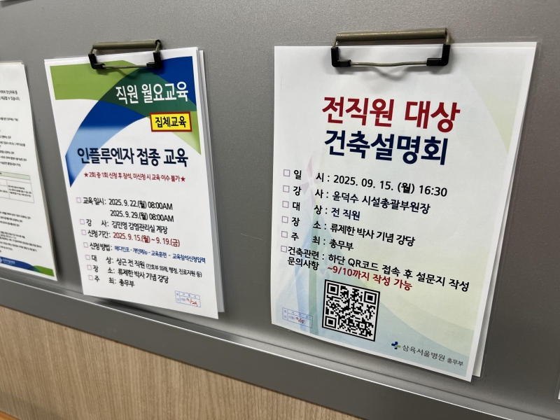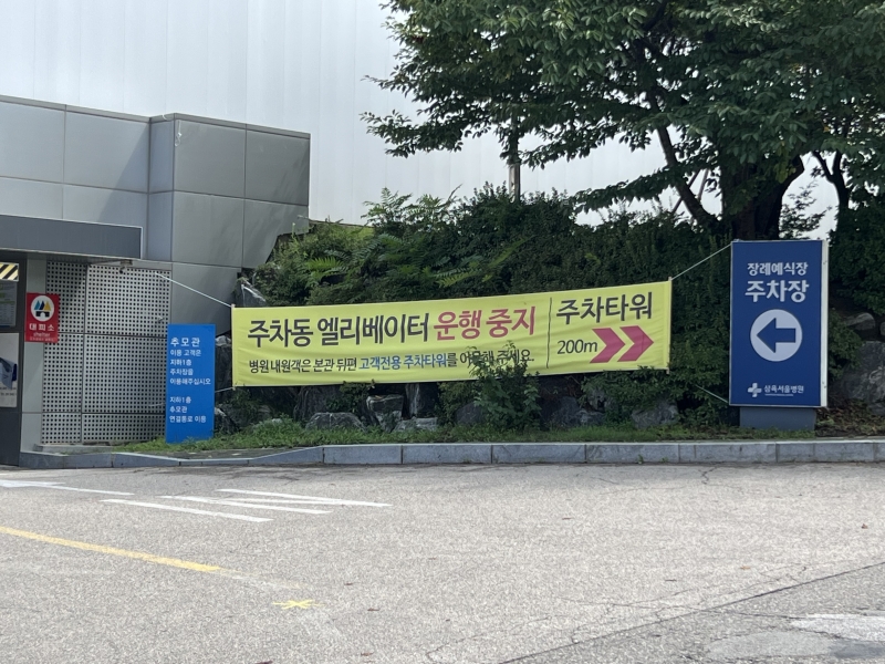 현재 공사로 인해 추모관 옥상주차장은 오는 9월 15일부터 폐쇄되며 주차동 엘리베이터도 멈춰 있는 상태다. 병원은 후문 방향 200m 거리 주차타워 이용을 안내하고 있다. 또 9월 5일(금) 오후 1시~6시에는 정전 작업이 예고돼 있어 일부 부서와 시설은 비상전력으로 운영될 예정이다.