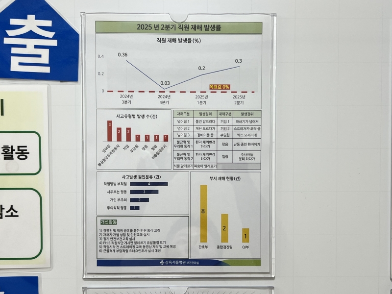 병원 내부 게시판에는 직원 재해 발생률 현황이 그래프로 게시돼 있다. 2025년 2분기 기준 재해율은 0.3%로 집계되며 사고 유형은 넘어짐, 찔림, 부딪힘 등이다. 주요 원인은 작업 방법 부족과 서두름, 개인 부주의로 나타나고 있으며, 간호부에서 가장 많은 사고가 발생했다. 감염관리 측면에서는 중심정맥관 관련 혈류감염 예방 지침 수행도가 공유되고 있다. 손위생과 소독 등 필수 항목 수행률은 평균 70~80%대를 보이고 있으며 문제점으로는 주입라인 관리 미흡과 소독 누락이 지적됐다.