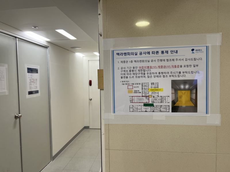 제중관 4층에 마련된 심전도실은 22일(토) 진료 종료로 인해 일부 문구가 가려져 있다. 또 한편에는 맥라렌 회의실 공사로 일부 통행이 제한돼 있고, 일부 진료과 원무수납 창구는 운영을 종료했다. 병원 내부 기둥에는 법원의 ‘임무해금지 가처분’ 고시문, 그리고 곳곳에 보이는 낡은 시설은 시간의 흔적을 고스란히 드러냈다.