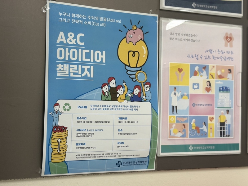 복도 한켠에 위치한 안내게시판에는 환자경험평가 최우수병원 선정 소식과 함께 병원 운영 아이디어 공모전 등 내부 공지 사항이 게시돼 있었다. 특히 눈길을 끈 것은 'A&C 아이디어 챌린지' 모집 공고였다. 병원 측은 수익 증대와 비용 절감을 위해 교직원을 대상으로 창의적인 개선 아이디어를 공모 중이며 총 300만원의 상금이 지급된다.