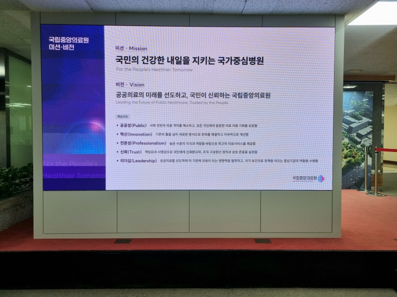 특히 최근 의료원 변화 중 하나로 본관 1층 로비 곳곳에 환자 소통 활성화를 위해 마련된 디지털 사이니지가 눈길을 끈다. 내부 게시판에는 의사 식사지시율, 임단협 타결 내용 등이 안내돼 있다. ‘기본급 3% 인상’과 ‘여름휴가비 상향’ 등 노동 환경 개선 성과가 소개되고, 여름 퀴즈 당첨자 명단이 붙어 있어 병원 일상을 보여주고 있다. ‘국가중심병원’을 표방한 국립중앙의료원의 정체성과 실험이 동시다발적으로 진행되고 있다. 낡은 공중전화기처럼 과거의 흔적은 여전하지만 국립중앙의료원은 내부부터 조용히 탈바꿈 중이다.