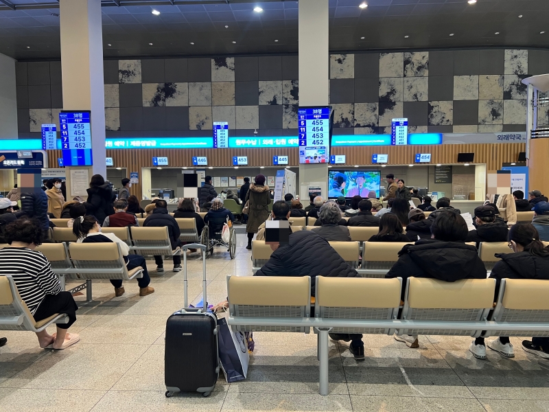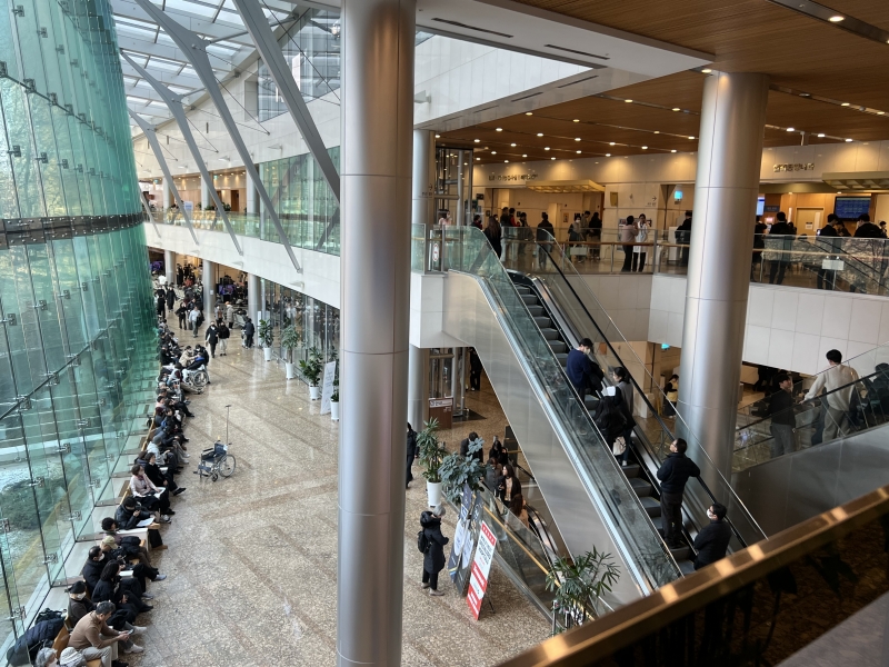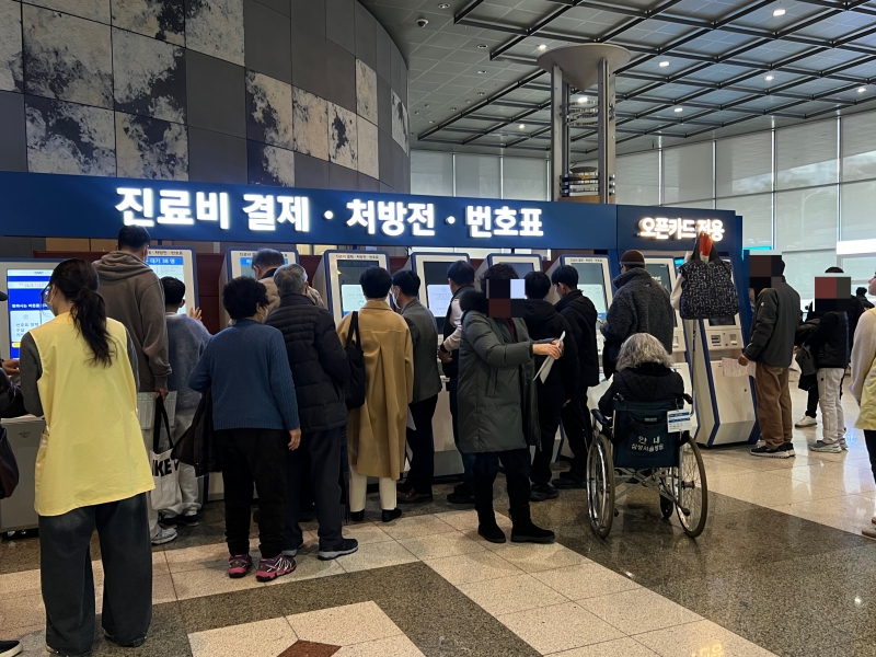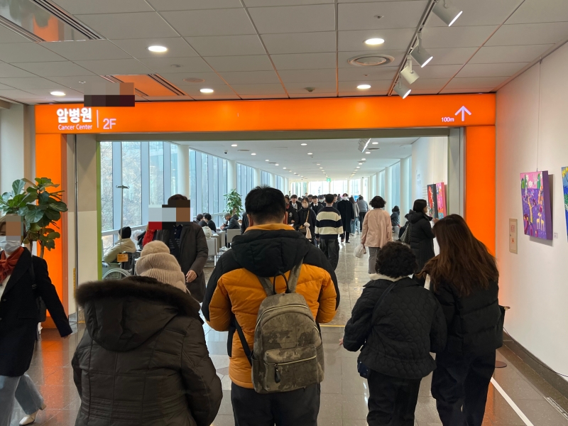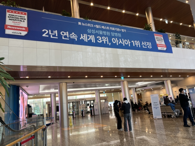 내부에서는 키오스크를 통한 진료비 결제·처방전 출력·번호 발권이 이어졌으며 대기석과 진료실 앞에서는 환자와 보호자들이 번호 호출 화면을 확인하며 차례를 기다렸다. 암병원 로비에서는 미국 뉴스위크가 진행하는 월드 베스트 의료기관 평가에서 '2년 연속 세계 3위, 아시아 1위 선정됐다'는 소식을 홍보하고 있다.