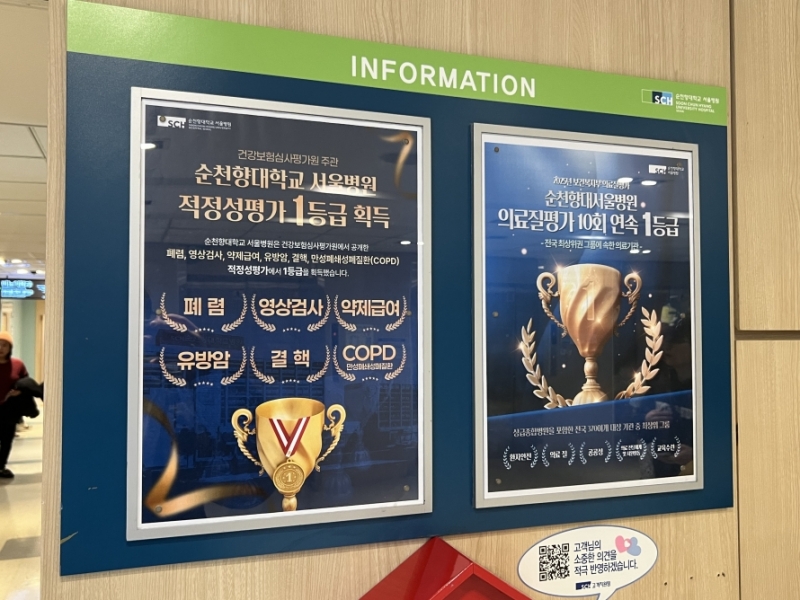 로비 한편에는 폐렴, 영상검사, 약제급여 등 6개 항목에서 건강보험심사평가원 적정성평가 1등급을 획득했으며, 의료질 평가에서도 10회 연속 1등급을 달성했다는 안내문이 부착돼 병원의 성과를 홍보하고 있었다.