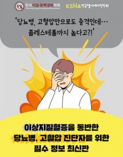 한국헬시에이징학회(회장 김철중, 조선일보 의학전문기자)가 한국지질·동맥경화학회 공동으로 제작한 ‘3대 만성질환 첫 진단자’를 위한 인포그래픽 3편 중 2편을 공개했다.2편은 ‘이상지질혈증을 동반한 당뇨병 또는 고혈압 환자의 최신 현황’, ‘이상지질혈증을 가진 성인들의 생활습관 분석’과 함께 ‘이상지질혈증이 부르는 질환’은 어떤 게 있는지를 담았다.한국지질·동맥경화학회가 지난 9월 발표한 ‘2024 이상지질혈증 팩트시트’에 따르면 당뇨병 환자의 87%, 고혈압 환자의 72%가 ‘이상지질혈증’을 갖고 있었다.또 당뇨병 환자의 44%는…