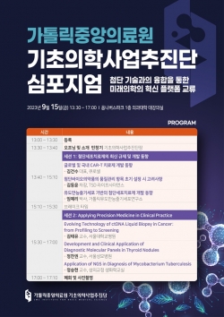 가톨릭대학교 가톨릭중앙의료원 기초의학사업추진단(단장 : 민창기 가톨릭중앙의료원 기획조정실장)이 첨단 기술융합을 통한 미래의학 개발에 박차를 가한다.가톨릭중앙의료원은 "오는 15일 옴니버스파크 1층 의과대학 대강의실에서 ‘첨단 기술과의 융합을 통한 미래의학의 혁신 플랫폼 교류’를 주제로 기초의학사업추진단 출범 기념 심포지엄을 개최한다"고 8일 밝혔다.가톨릭중앙의료원 기초의학사업추진단은금년 3월 ‘바이오 기초융합을 통한 5차 산업혁명 선도’라는 비전으로 출범했다.이들은 이번 심포지엄을 통해 첨단세포치료사업단, 초정…