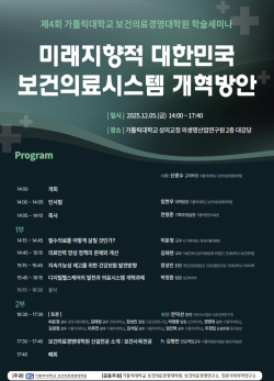 가톨릭대학교 보건의료경영대학원이 각계 전문가들과 함께 한국 사회가 직면한 의료 이슈와 지속가능성을 논의하는 장을 마련한다.보건의료경영대학원은 12월 5일 오후 2시 가톨릭대학교 성의교정 의생명산업연구원 2층 대강당에서 ‘미래지향적 대한민국 보건의료시스템 개혁 방안’을 주제로 학술세미나를 개최한다.이번 학술세미나는 급속한 인구 고령화와 의료비 지출 증가, 정책 변화에 따른 의료기관 대응, 그리고 의정사태 이후 발전적 의료혁신 방향 등 우리 보건의료체계 핵심 이슈들을 심도있게 논의하기 위해 준비됐다.학술세미나 1부에서는 ▲허윤…