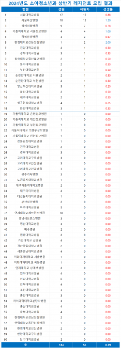 날개 없는 추락을 이어가는 소아청소년과가 올해도 어김없이 처참한 성적표를 받았다.정부가 수가 인상 등 당근책을 내놨지만 기피현상은 여전했다.6일 데일리메디가 2024년도 전반기 전공의 1년차 모집을 진행한 수련병원 60곳을 분석한 결과, 소아청소년과는 총정원 184명에 54명이 지원해 경쟁률 0.29대 1을 기록했다.지원자를 한 명도 받지 못한 곳은 60곳 중 42곳에 달했고지방병원은 물론 빅5 병원마저 지원자가 '전무(全無)'했다.이번 모집에서 소청과 전공의 충원에 성공한 병원은 3곳에 불과했다. 지난해 2곳 대…