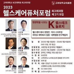 고려대학교 보건대학원(원장 윤석준)이 ‘제2기 헬스케어퓨처포럼’ 최고위 과정 멤버를 모집한다. 교육 대상은 헬스케어 경영진, 의사 스타트업, 바이오 제약회사 임원 등이다.이번 최고위 과정 모집은 7월 25일부터 9월 1일까지이며, 강의는 오는 9월부터 2024년 1월까지 16주간 매주 화요일 고려대학교의료원 고영캠퍼스(강남구 청담동 소재)에서 진행된다.강의자는 ▲강도태 前 복지부 제2차관 ▲나군호 네이버 헬스케어연구소장 ▲서정선 마크로젠 회장 ▲선승훈 코렌텍 의장 ▲이우용 삼성서울병원 암병원장 등 각 분야 최고 전문가들로 구성됐다.…