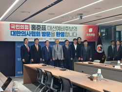 홍준표 국민의힘 대통령선거 예비후보가 "집권하면 의과대학 증원 등 의료현안 문제 해결 절차에 돌입하겠다"고 밝혔다.22일 오후 홍준표 후보는 국민의힘 김대식 의원과 함께 서울 용산구 소재 대한의사협회 회관을 찾았다.의협 측에서는 김택우 회장, 박단 부회장, 한진 법제이사, 서신초 총무이사, 박명하 상근부회장, 문석균 의료정책연구원 부원장, 박명준 기획이사,